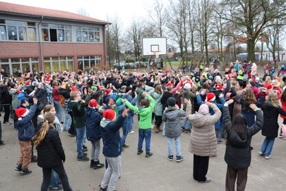 Am Donnerstag, den 12.12. haben sich rund 200 Schülerinnen und Schüler der 5. und 6. Klassen der OBS Wiefelstede ausgestattet mit Weihnachtsmannmützen und Plüschrentiergeweihen, aufgemacht um den Grundschülern eine Weihnachtsüberraschung zu bereiten. Mit viel Elan habe sie einen Flashmob-Tanz zu einem aktuellen Popsong dargeboten und bei den Grundschülern für großes Erstaunen gesorgt.
